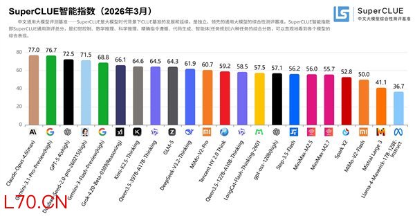 快科技3月30日消息,中文大模型基准测评SuperCLUE发布2026年3月最新结果,22款国内外主流模型参与角逐。