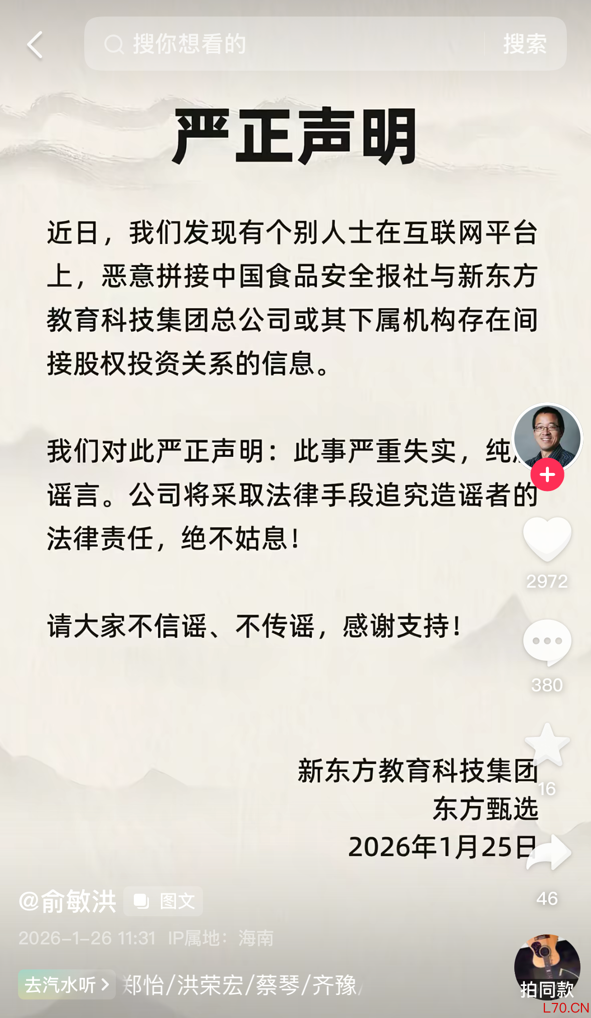 俞敏洪辟谣中国食品安全报社与新东方存在间接股权投资关系:严重失实俞敏洪辟谣中国食品安全报社与新东方存在间接股权投资关系:严重失实
