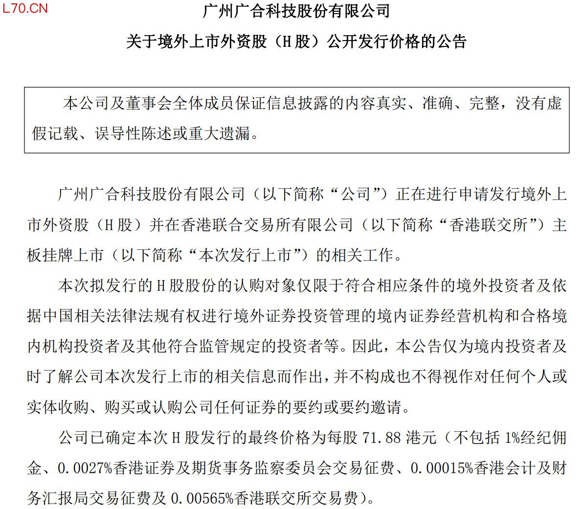 3月18日晚间,广合科技(SZ001389,股价119.68元,市值510.37亿元)公告称,正式确定H股发行的最终价格为每股71.88港元(约合人民币63.03元)。这一价格不包含经纪佣金、交易征费及交易费等相关费用。公司H股预计将于2026年3月20日在香港联合交易所主板正式挂牌并开始交易。