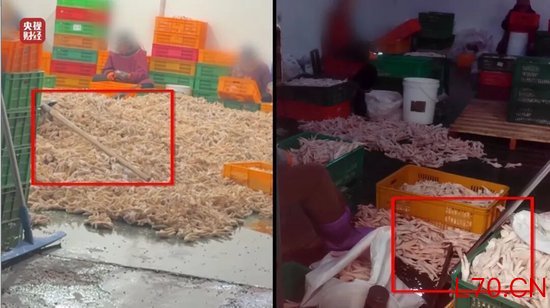 在这个车间里,大量鸡爪直接裸露堆放在潮湿肮脏的地面上,扫帚、铁锹等清洁工具随意压放在鸡爪之上。即便鸡爪被人踩踏,工人也只是随手捡起,直接放回加工筐中继续使用,完全无视食品卫生安全。