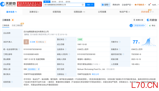 天眼查App显示,四川省蜀福香食品有限责任公司成立于1997年12月,法定代表人为王立群,注册资本2380万人民币,经营范围包括食品生产、食品销售、餐饮服务等,由成都市众兴食品有限公司、四川省荣盛泰集团有限责任公司共同持股。