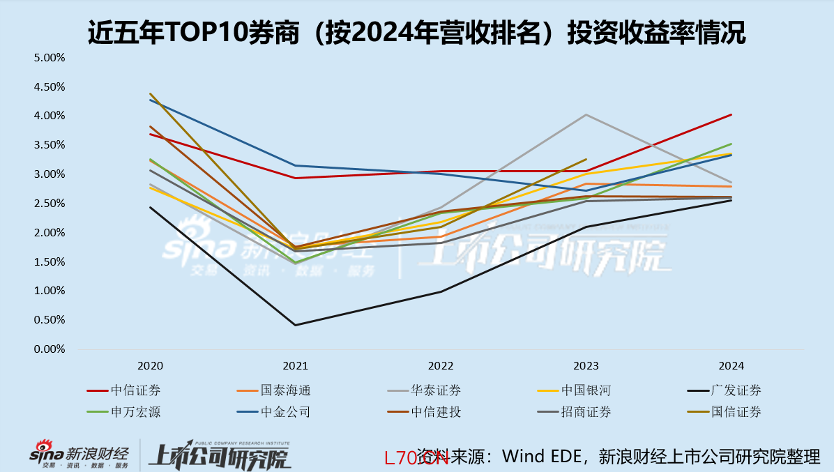 这使得招商证券的投资收益率远落后于其他头部券商。在营收TOP10券商中,招商证券的投资收益率常年位列倒数第二、倒数第三,长期表现仅优于广发证券。