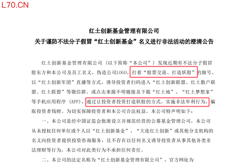 红土创新基金12月7日公告则显示,不法分子假冒股东方和公司及员工名义,伪造公司LOGO,打着“股票交流、打造妖股”的旗号、以“红土创新军团”直播等方式,诱导投资者扫码进入“红土创新联盟、红土散户联盟、红土联盟”等微信群或点击来源不明链接及下载“红土地”“红土梦想家”等手机应用程序(APP),通过让投资者投资打造妖股的方式,实施非法牟利行为,骗取投资者钱财。